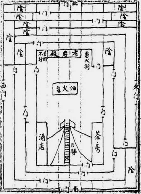 (二)接度师,走倒街,由东门出,依街路而行,又转进北门,到老君殿前时,绕老君殿三次,走出南门,又转进西门,到老君殿前时,举行传法。传法亦有一定之程序,先传各种手诀,次传红衣牛角师刀筶子等项一概传毕。吃阴合同,始行上刀梯,下绘玉皇街道图一幅以作参考。
